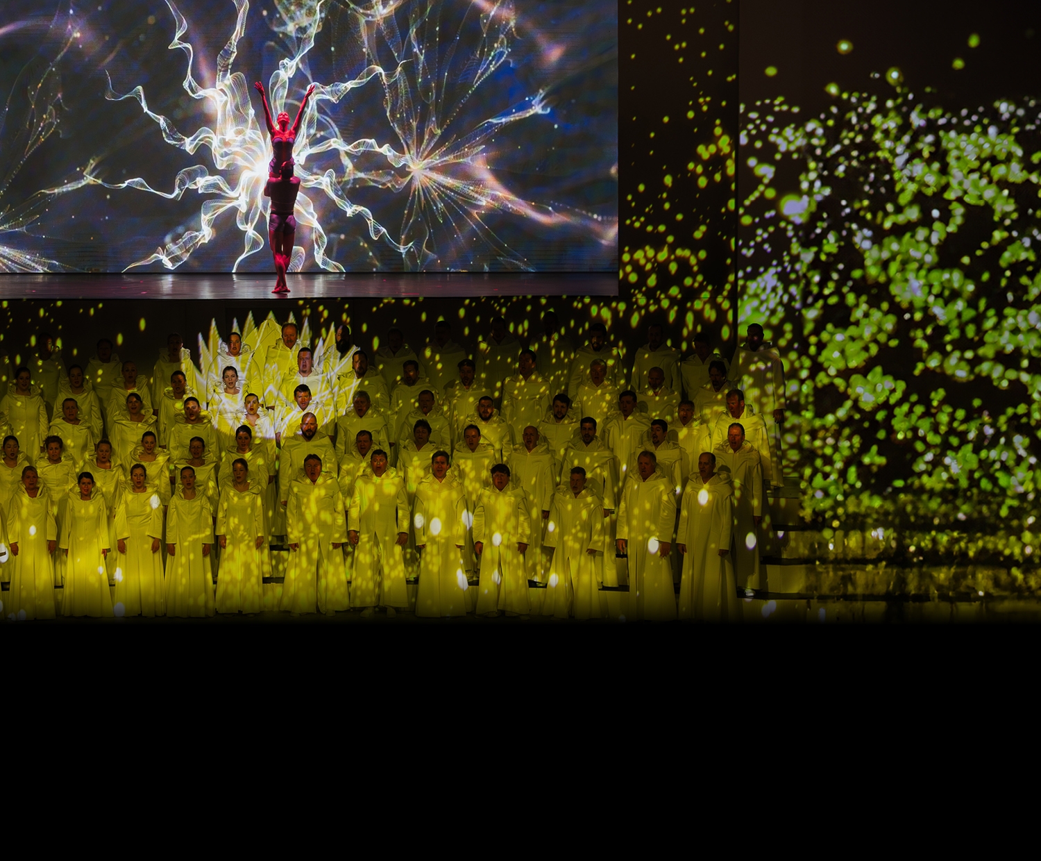 Z. Á.: Olyan ősi szimbólumokból építkeztünk, amelyek a magyar és az egyetemes jelképrendszerben is fellelhetők: megjelenik majd a főnixmadár, azaz az újjászületés, az örök körforgás szimbóluma, továbbá az életfa, a nap és a hold és a lótuszvirág is, amely meglepő módon nemcsak a keleti, hanem a magyar motívumok közt is megtalálható. Papp Tímeával, a Freelusion kiváló koreográfusával kidolgoztuk, hogy mely tételek alatt legyen tánc, amelyeket a Magyar Nemzeti Balett kiváló balettművészei táncolnak, és tavasz végén elkészültek a koreográfiák. A vizuális anyag pedig több dimenzióban jelenik meg: a térbeli és síkbeli felületeken felül a három szólistára és a mintegy 100 fős énekkarra is vetítünk. Reményeink szerint egy mágikus, virtuális valóságba repítjük el a nézőket Orff elementáris muzsikája és az egyedülálló vizuális élmény segítségével.